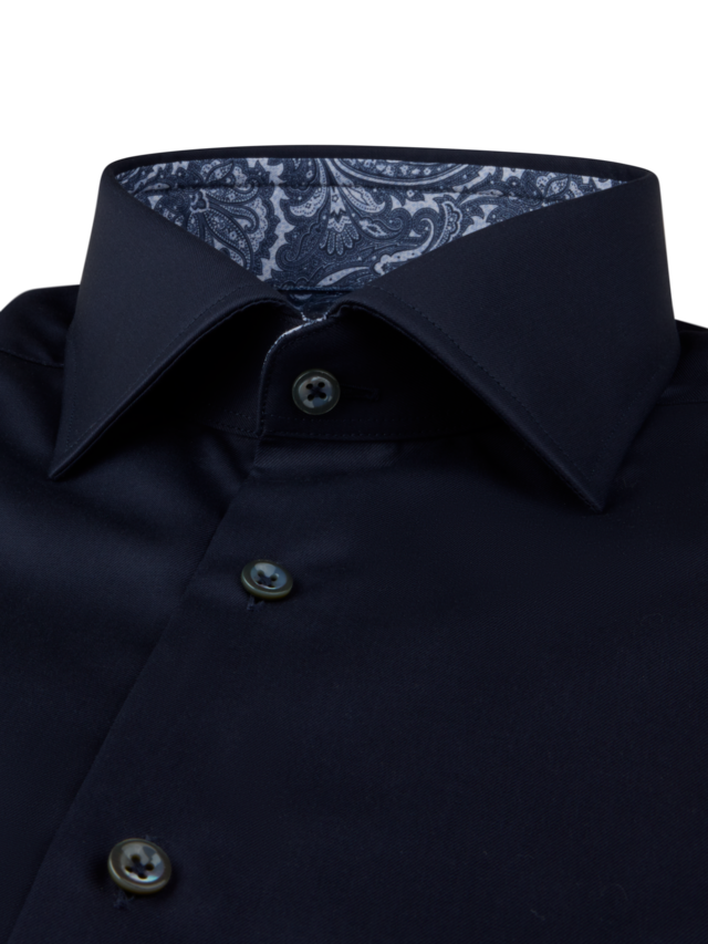 This twill shirt is made of twofold cotton. The shirt is designed with contrast inside collar and cuffs and is detailed with mother of pearl buttons, single cuffs and a cut away collar.
