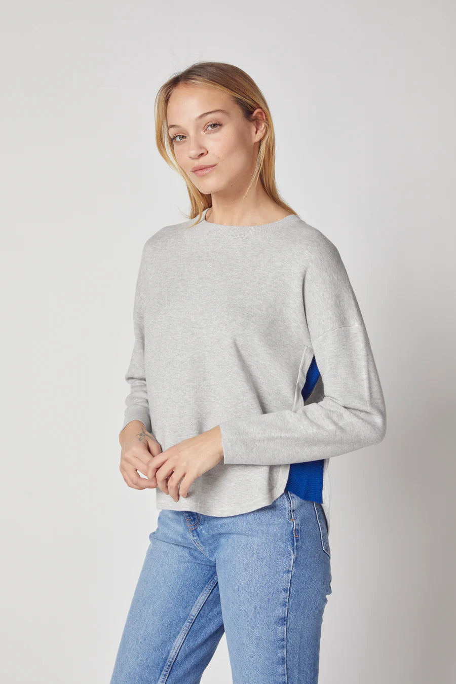 Kokun Shirttail Hem Pullover in Grey/Cobalt